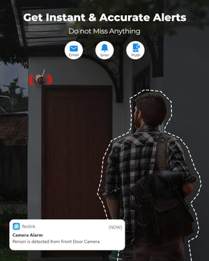 Smart Detection: Detects people and vehicles, sending real-time alerts via push notifications, email, or siren.