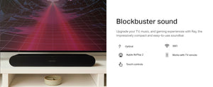 The Sonos Ray Compact Soundbar (Black) delivers premium, room-filling sound in a sleek and compact design — perfect for upgrading your TV and music experience. Despite its small size, it produces clear, powerful, and balanced audio that enhances every scene, song, and game.