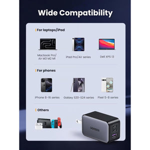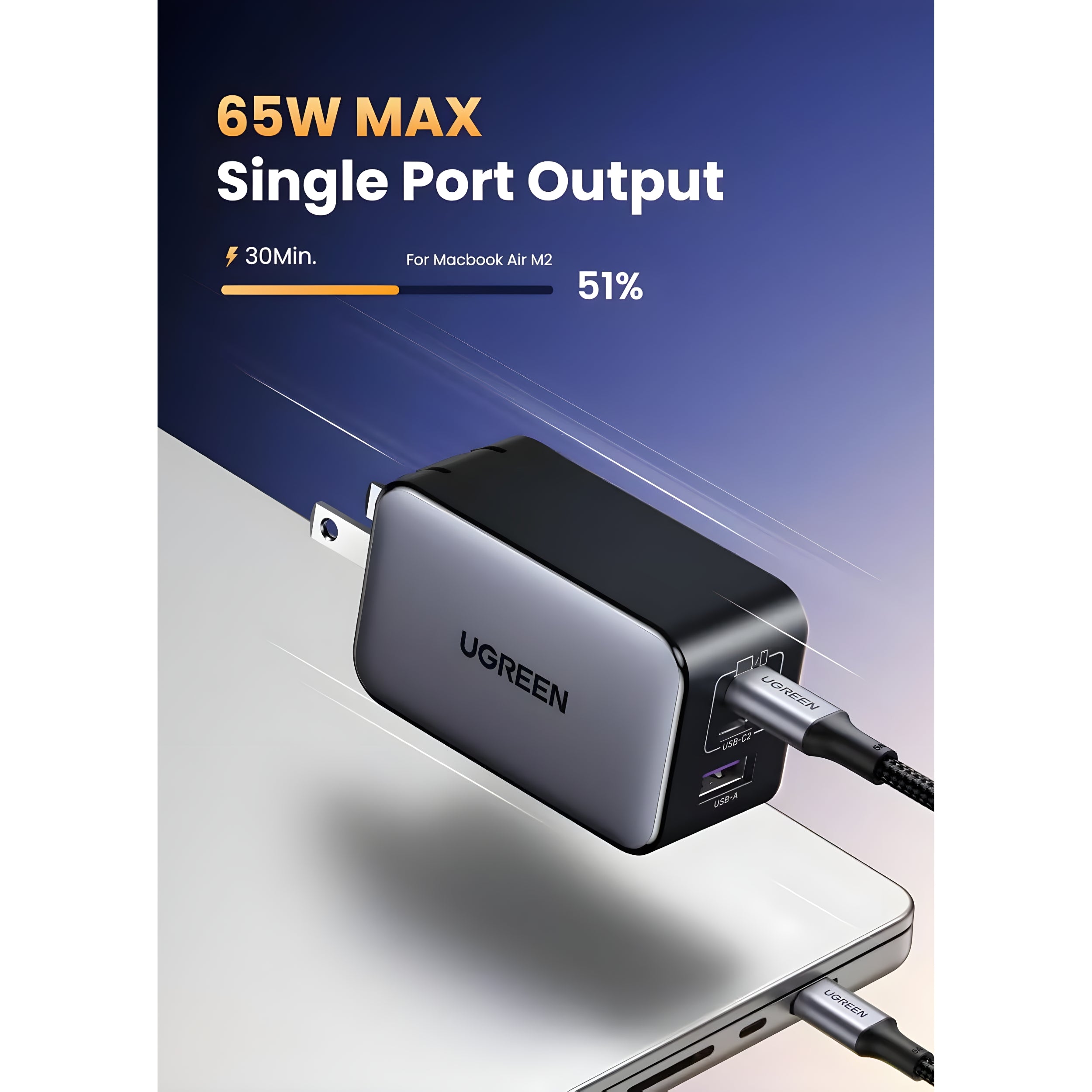 UGREEN Nexode 65W GaN 3-Port USB-C Wall Charger (US Plug, Black)