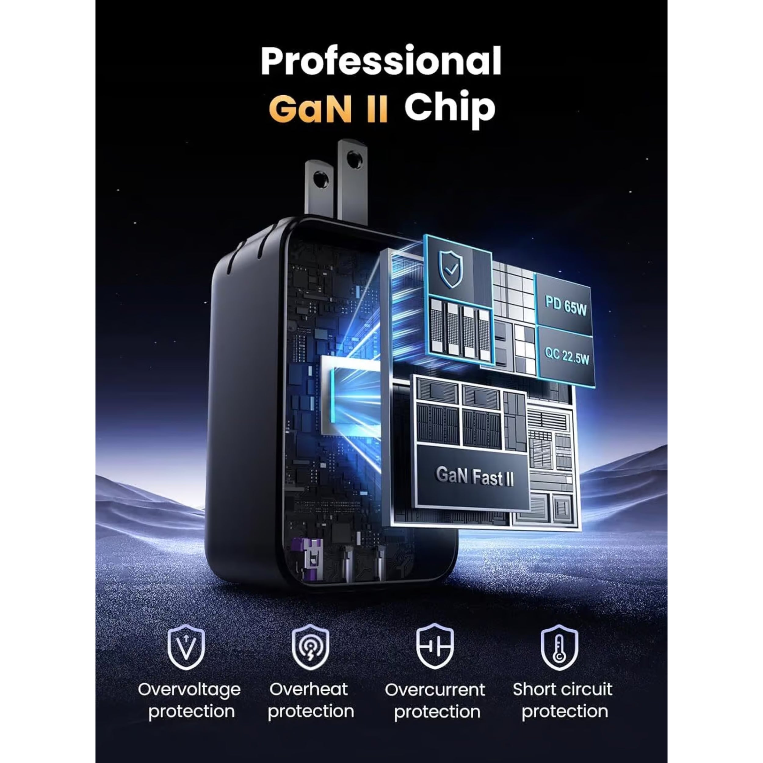 65W High Power Output: Delivers up to 65W for fast charging laptops, tablets, and smartphones.